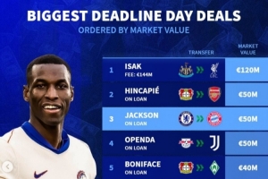 九游体育直播-截止日转会身价榜:伊萨克领跑,因卡皮耶&杰克逊&奥蓬达并列次席